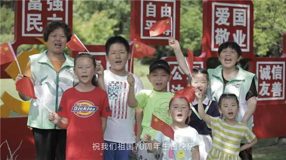 先进模范、志愿者、青年代表们挥手欢呼,对着镜头用心、用情告白祖国:“祖国万岁,中国加油!”“中华民族复兴的脚步不可阻挡,我爱你中国!”“祝福祖国,祝福庙行,祝福场北,天更蓝,山更绿,水更清”。