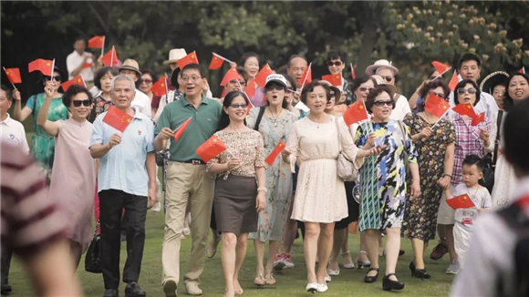 随着乐曲的推进,人流汇集,“我和我的祖国,一刻也不能分割。无论我走到哪里,都流出一首赞歌……”人们挥舞着手中的五星红旗,同声高唱《我和我的祖国》。