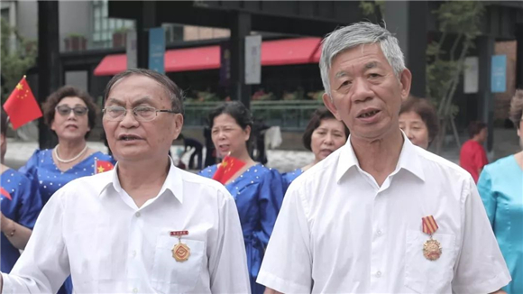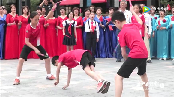 在悠扬的旋律当中,全国人民调解工作先进个人朱志仁、全国道德模范姜万富、上海市劳模张前庆、“感动宝山”先进人物(提名)刘凤妹、各优秀企业家代表、各艺术团队代表、江湾中心校合唱团的少年们……惊喜出现在人流如梭的广场上,他们用自己的歌声唱响《我和我的祖国》。
