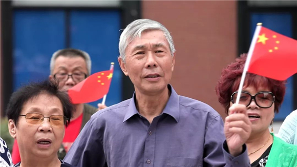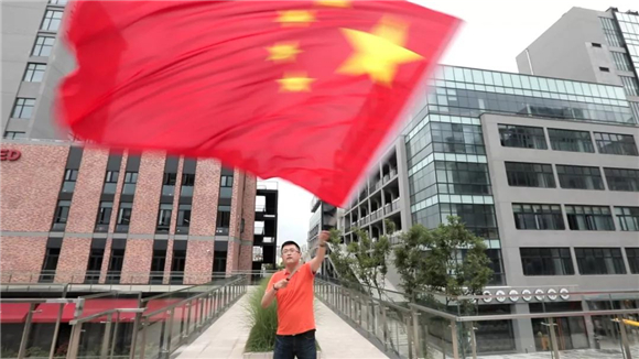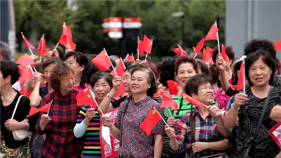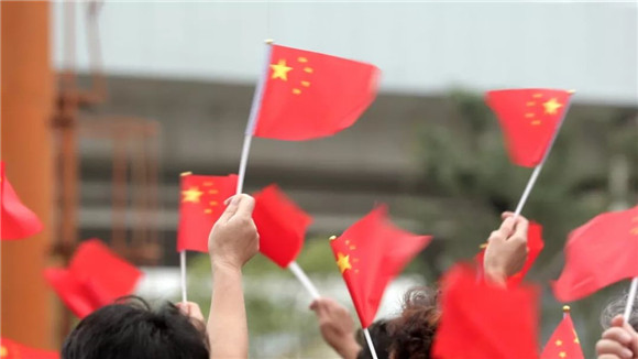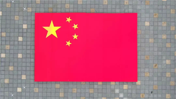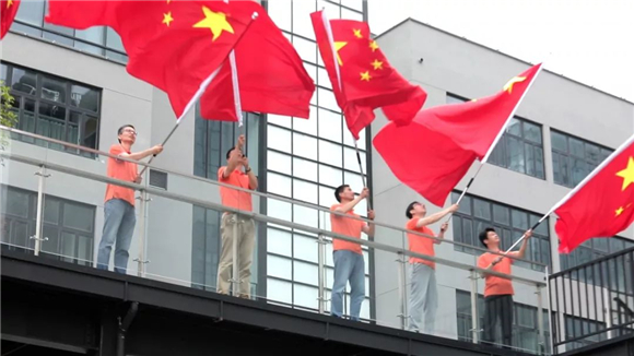 顿时,新业坊的火车头广场成了一片红色的欢乐海洋:人们兴奋地互相挥舞着小国旗,在大家齐心合力下举起一面巨型国旗…