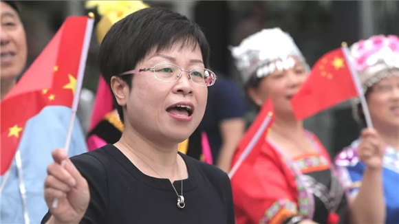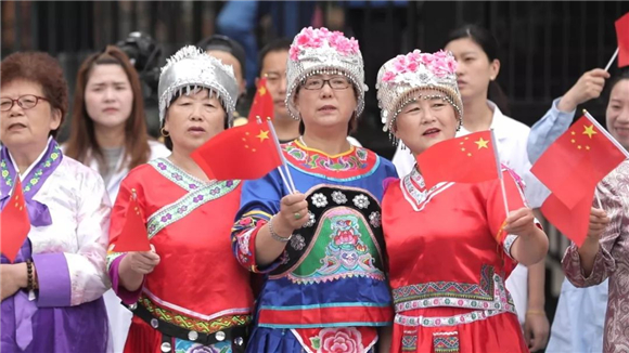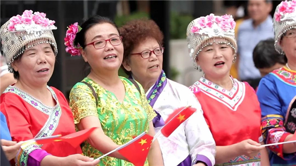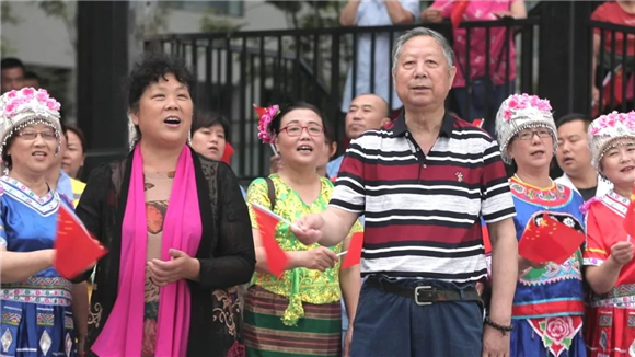 少数民族们身着鲜艳的民族服饰,热情的融入现场,与大家相聚在一起,他们用歌声为祖国母亲献上赞礼。