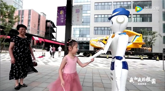 随着法律服务机器人“小法”和小女孩的邂逅,《我和我的祖国》快闪活动高境镇篇拉开了帷幕,机器人用自己独特的声音唱出了“我和我的祖国,一刻也不能分割”,特别的歌声展现了高境的科技力量。