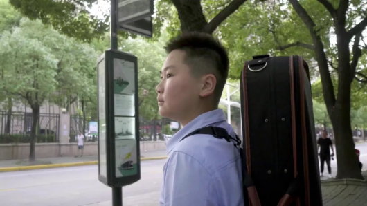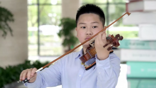 在人群中,一个背着小提琴的小男孩格外引人注目,进入华滋奔腾大厦大厅后,小男孩拉起了小提琴。《我和我的祖国》的旋律缓缓流出,吸引了许多人驻足围观。