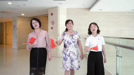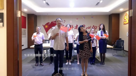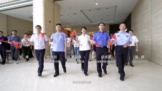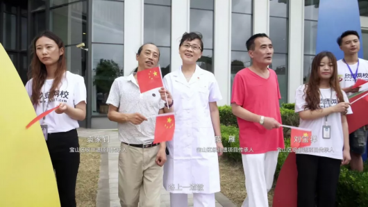 全国模范人民调解员魏刚,全国孝亲敬老之星林红,上海市劳动模范徐小桃,上海市三八红旗手吴筠,上海市五四青年奖章(个人)施海燕,宝山非遗代表性传承 人袁家钊、刘宝祥、陈雁,华滋奔腾联合党支部代表,公安、城管、税务所、市场所、卫监所代表,合唱队代表,学生代表,机关青年代表从园区、大厦的各个位置 涌出,在人群中领唱《我和我的祖国》。