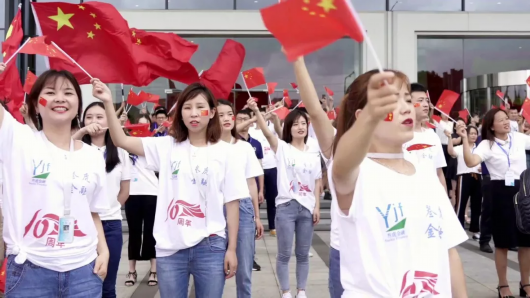 坚定的步伐、高亢的歌声让全场气氛逐渐沸腾,五百多名企业员工自发参与到快闪活动中,他们挥舞着小红旗,拍摄现场热闹的场景,脸上带着由衷的欢乐和自豪。