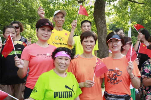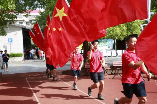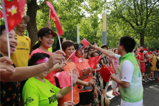 共建单位代表挥舞着红旗从广场上跑过,经过的居民们纷纷拿出手机驻足观看,这时现场氛围火热、人头攒动。