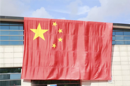巨幅国旗从屋顶落下,这一幕将现场氛围推向高潮,人们高声合唱着:“我和我的祖国,一刻也不能分割。”他们用歌声表达自己心中对祖国的热爱。