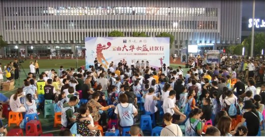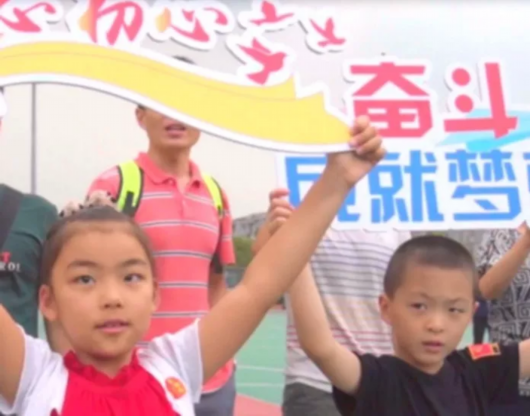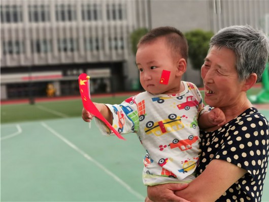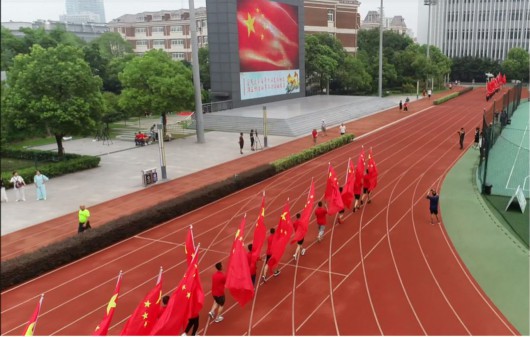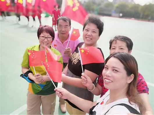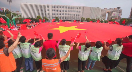 体育场上国旗招展,忽然出现的红旗队,惊讶了广场上的人群。伴随着熟悉的旋律,人们循声张望,红旗队挥舞着五星红旗,国旗飘扬,在两位小朋友天籁般的歌声中,活动拉开帷幕。