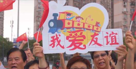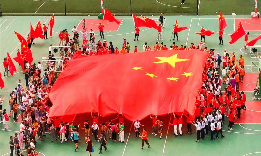 合唱渐入高潮,一幅巨大的五星红旗在体育场内展开,瞬间点燃现场气氛,很多人一同钻入国旗的“怀抱”,同时纷纷拿出手机拍摄,浓浓的爱国情愫涌动在这移动的巨幅国旗下,徜徉在这体育场的空中。