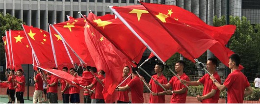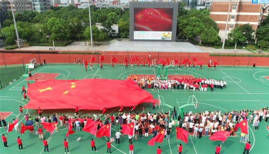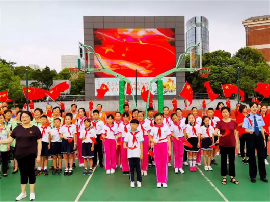 随着乐曲的推进,越来越多的人自发地加入合唱队伍,参与快闪活动的志愿者们纷纷将小国旗分发给驻足观看的游客,大家挥舞着五星红旗,尽情歌唱,向祖国表达由衷的热爱与祝福。