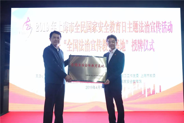 司法部普法与依法治理局副局长刘汉银代表全国普法办向上海国家安全教育馆授“全国法治宣传教育基地”牌。
