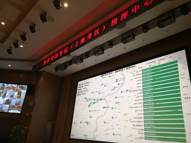 指挥中心内,市司法局党委书记、局长陆卫东,华东政法大学校长叶青,华东政法大学国家司法考试中心主任杜志淳,市司法局党委副书记、政治部主任刘卫萍,巡视员刘建华,坐镇指挥。市气象局、市环保局、市国家保密局、市公安局、市无线电管理局、市电力公司以及华东政法大学集体进驻。