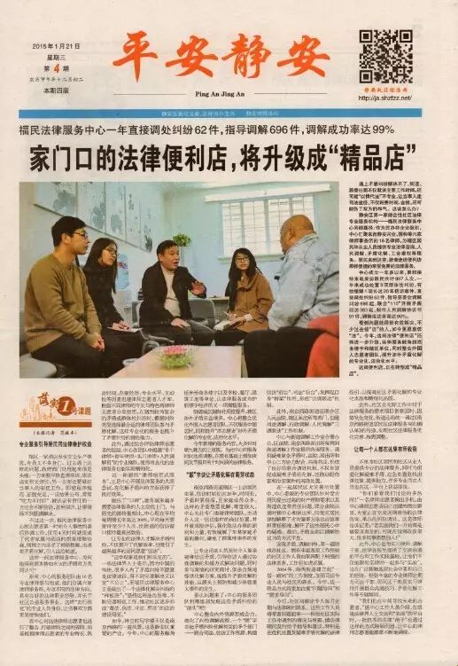 中心响应居民需求,实现律师天天有的目标,并设置专门预约咨询电话,人民调解员全天接待。除此之外,中心联合区法院诉调对接中心平台,设立每周一下午为“诉调对接日”;联合公安派出所,设立每周五下午为“民警值班日”;联合区劳动保障协会、仲裁委,设立每周二、周三上午为“劳动争议咨询日”;联合德瑞姆心理咨询中心,设立每周五上午为“心理咨询日”。在法治宣传中实践“多方联动”,有效解决居民群众最为迫切的“最后一公里”问题。