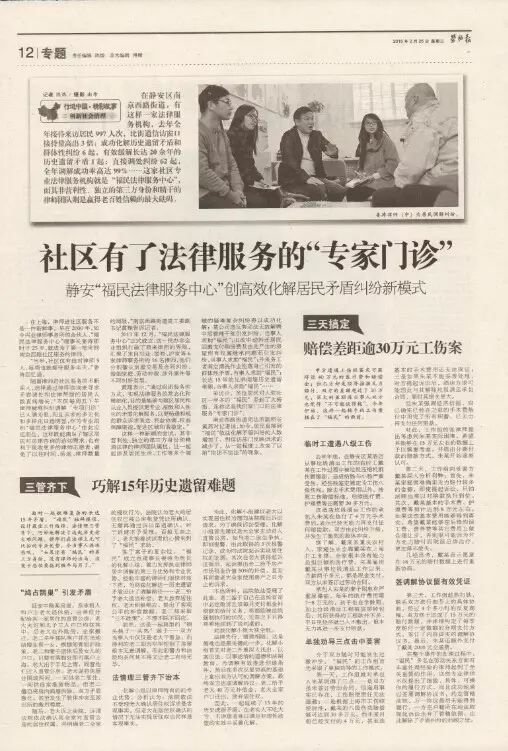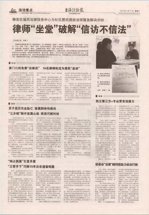福民法律服务中心合作创设“律师顾问团”及“一居一顾问”制度,在街道层面配备“律师顾问团”,在每个居委会配备法律顾问。“律师顾问团”及时介入复杂疑难信访矛盾,引导信访人通过协商调解的和缓方式解决,同时参与案情的研究商讨,依法合规地提供化解方案,提升矛盾化解的效能。二是“律师顾问团”定期为街道审核对外签订的合同,开展相关合同的社会风险评估,保障所签合同依法合规。三是律师定期为居民区“送法”,作为居委会的结对法律顾问,为居委会开展各项行政工作提供法律支持,从源头上预防和减少涉稳重大事件的发生。