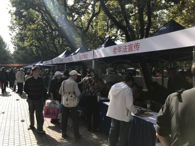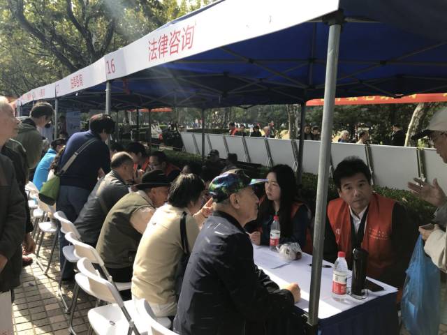 在复兴公园,上海市举行大型宣传咨询为老服务活动,活动现场举办了市老龄办、市民政局、市法宣办、市司法局共同主办的老年人权益保障知识竞赛颁奖仪式,设有十余处法律咨询、法律援助、老年公证、老年法宣传服务点,为各类公益服务数量之首。市法援中心、市律协精心选派律师和法援工作人员,受到老年朋友的欢迎。